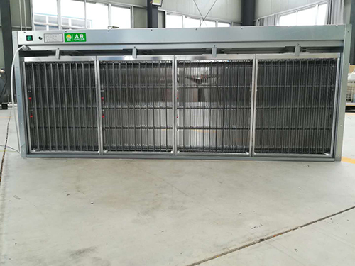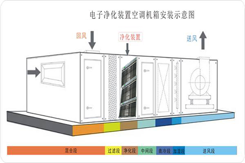 中央空調電子空氣淨化器通過中央空調循環流動風的方式對房間內的空氣進行淨化。本淨化器由金屬過濾網、高壓靜電除塵器、集塵室組成。大部分 “重”的顆粒物在通過電子空氣淨化機的金屬過濾網時被過濾。更小的顆粒物隨氣流進入電離區(通過PWM電流型高頻變換技術,輸出7500V-8500V穩壓、恒流的直流電壓,形成強電場)時,被高電壓電離—賦予正電荷。當帶正電荷的粒子通過帶有負電荷的集塵板(輸出4500V-5500V恒流的的直流高電壓)時被吸附在集塵板上,強電場可擊穿附著在顆粒物表麵的細菌、病毒和微生物的細胞壁,並將其殺死。安裝方式:管道式、回風口式、機組式。